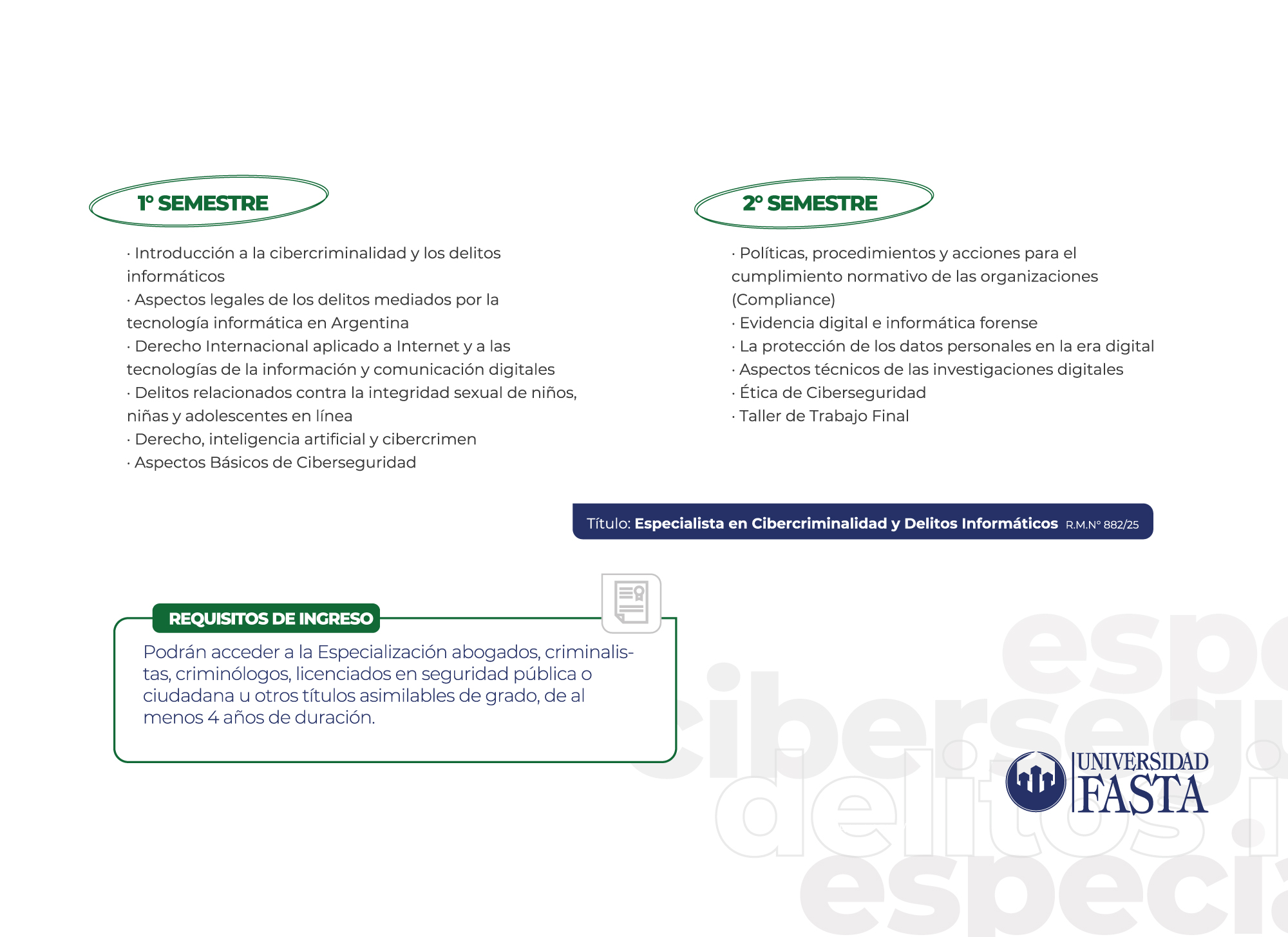 La Especialización en Cibercriminalidad y Delitos Informáticos surge como respuesta a esta demanda, integrando una formación jurídica, criminalística y tecnológica que prepara a los profesionales para interpretar, investigar y prevenir los delitos informáticos, en articulación con los marcos normativos nacionales e internacionales vigentes.