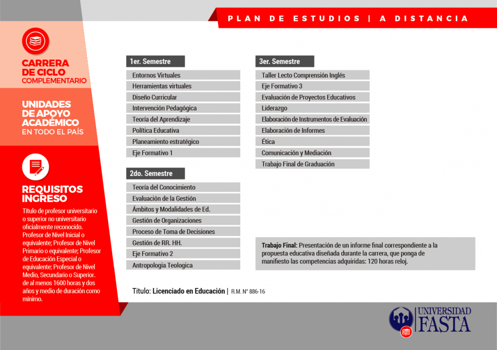 - Condición de ingreso aprobada por RM 886/16: título oficial y de validez nacional de 1600 horas reloj de formación.