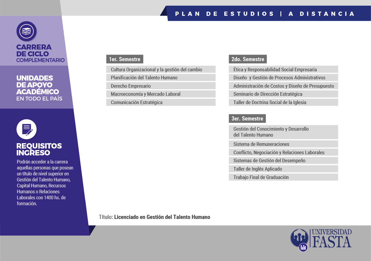 La nueva carrera Licenciatura en Gestión del Talento Humano de la Universidad FASTA tendrá una duración teórica de 3 semestres, a lo cual se le deberá adicionar el tiempo destinado a rendir finales y presentar el trabajo de graduación. Tiene previsto la realización de actividades de extensión y transferencia hacia el medio en el cual se encuentra inserta, como así también se ofrecerán talleres y cursos de extensión abiertos al público.