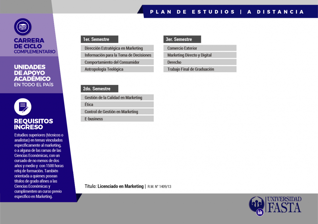 La Licenciatura en Marketing ofrece a todos sus estudiantes una formación y capacitación dotada de las más modernas herramientas e instrumentos utilizadas por las empresas más exitosas e innovadoras del mercado que permiten afrontar con mayor profesionalidad, practicidad y competitividad de los desafíos que demandan las organizaciones del tercer milenio.